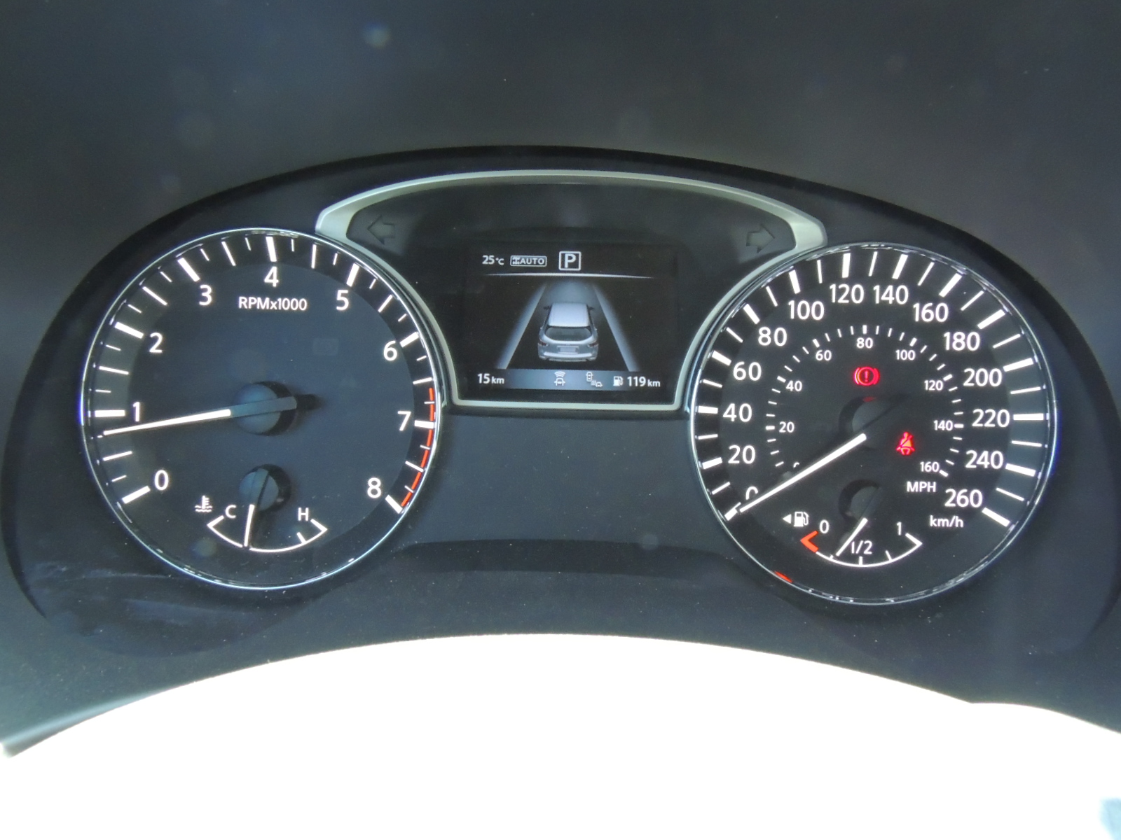 La pantalla Nissan Advanced Drive-Assist ® (ADAD, por sus siglas en inglés) está localizada al frente en el panel de instrumentos, entre el tacómetro y el velocímetro, y muestra información adicional de asistencia para el conductor.