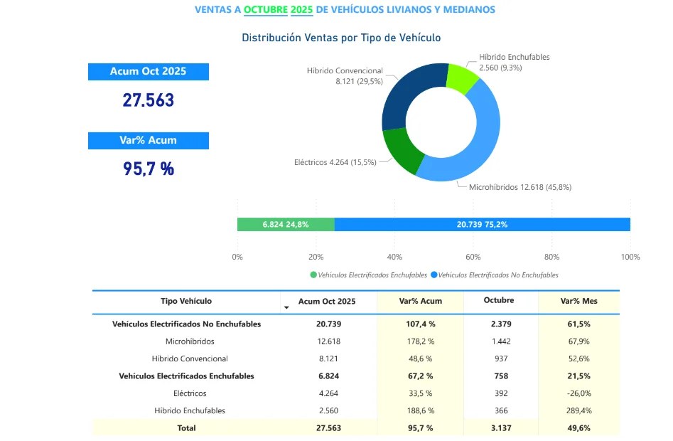 ANAC informa que las inscripciones de nuevas energías llegaron a 27.563 unidades a octubre de 2025. Los microhíbridos e híbridos convencionales lideran el crecimiento, mientras persisten desafíos en infraestructura y normativas.