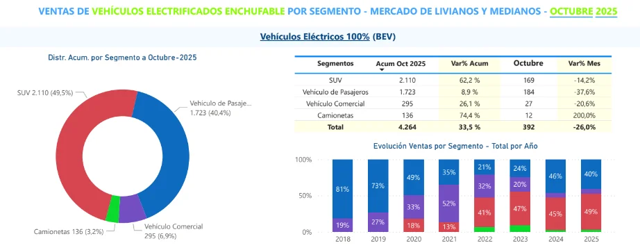 El informe de ANAC muestra que las tecnologías de cero y bajas emisiones están experimentando una expansión sin precedentes. Entre enero y octubre, se inscribieron 27.563 unidades, marcando un aumento del 95,7% respecto del mismo periodo de 2024.El mercado automotor chileno sigue avanzando hacia la electromovilidad. Según el Informe Cero y Bajas Emisiones de ANAC correspondiente a octubre de 2025, las ventas de vehículos de nuevas energías crecieron 95,7% en el acumulado del año, superando las 27 mil unidades. Aunque los híbridos y microhíbridos muestran un aumento significativo, la asociación advierte sobre la necesidad de incentivos directos e infraestructura adecuada para consolidar la transición energética.
